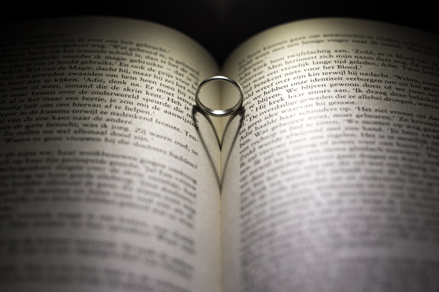 Het geheim is om het licht van achteren te laten komen en een ring tussen de pagina’s van een opengeslagen boek te plaatsen. Door de bolling in de bladeren krijg je de vorm van een hart!