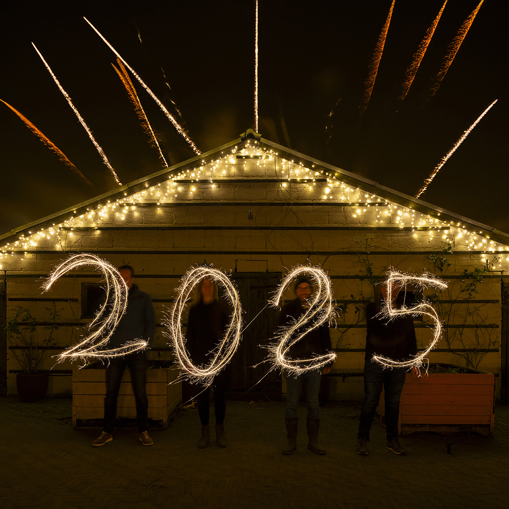 Stap 4: Geef je modellen duidelijk aan dat ze het jaartal met sterretjes in spiegelbeeld moeten schrijven. Anders klopt het niet op de foto. Zorg daarna dat de sterretjes van de vier mensen tegelijkertijd worden aangestoken en tel af.