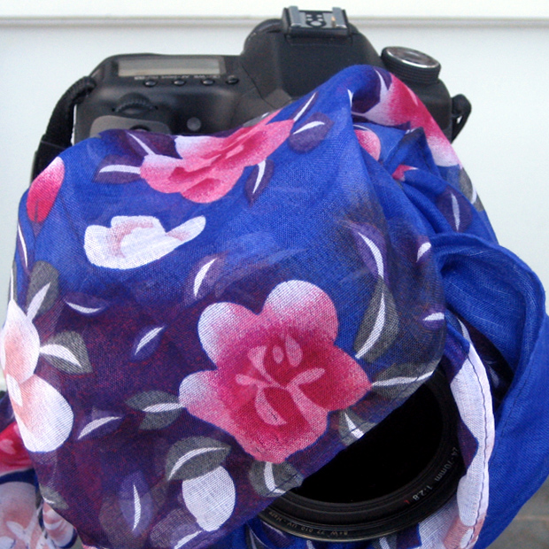Het ziet er misschien een beetje raar uit, zo’n shawl om je camera, maar effectief is het wel! Probeer gewoon wat uit, iedere shawl geeft een ander resultaat en iedere kleurencombinatie of print zal een verrassend effect geven. Heb je dit geprobeerd? Ik zie graag het resultaat!!