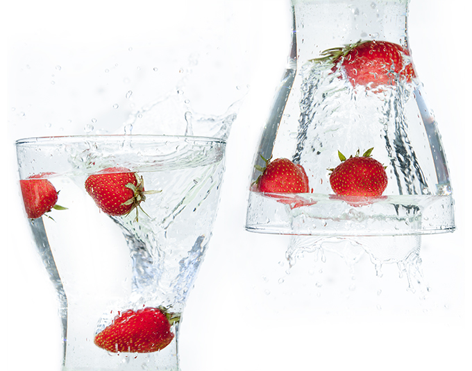Heb je het ritme te pakken? Probeer dan eens twee aardbeien! Gooi ze beide net na elkaar in het water of laat er eentje in dobberen en gooi de andere erbij. Ik deed dit aan het einde zelfs met drie aardbeien omdat het een lekker fris en kleurrijk geheel geeft op je foto. Maar dat is natuurlijk helemaal aan jou. Verschillende soorten fruit zijn ook leuk en zomers. Gebruik dus je eigen creativiteit om de foto’s persoonlijk te maken!