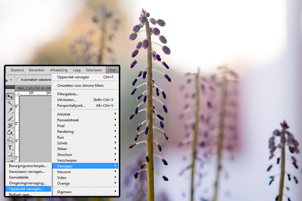 Stap 3: Zorg dat je dubbele laag (de bovenste) geselecteerd is en ga nu boven in je menubalk naar ‘filter à vervagen à oppervlak vervagen…’