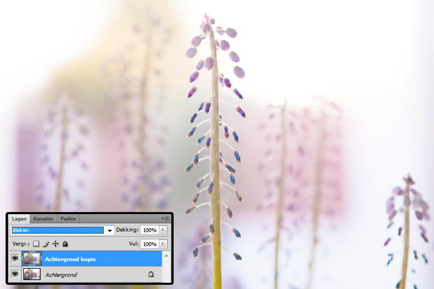 Stap 5: Zet nu je vervaagde laag boven in je lagenpalet op ‘bleken’. Hierdoor komt je onderste afbeelding weer deels door door je foto heen schijnen waardoor je foto niet wazig blijft maar zijn scherpte terugkrijgt. Alle kleuren worden wel veel lichter en dromeriger.