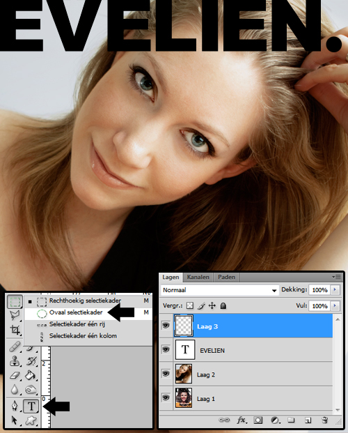 Stap 3: Klik nu het tekstgereedschap aan en typ je naam in het lettertype ‘Arial Black’. Dit lijkt het meeste op het lettertype van LINDA. Typ je hele naam in hoofdletters en schuif het links en boven helemaal tegen de rand van je document. Vergroot/verklein het tot je hem zelf mooi vindt staan. Daarna maak je met het selectiegereedschap een rondje en in een nieuwe transparante laag vul je deze met zwart. Dit is de punt! Die is namelijk rond, en de punt in het lettertype is vierkant. Schuif hem achter je naam en schaal hem zo nodig zodat hij er goed bijpast.