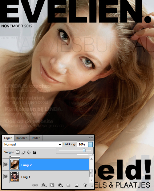 Stap 4: Voeg steeds meer teksten toe! Linksboven de maand en het jaartal, rechtsonder teksten die op je slaan. Zet af en toe de laag van je foto op transparant zodat de originele LINDA. door je foto schijnt. Dan weet je waar je ongeveer je teksten moet zetten en hoe de opmaak van LINDA. gebruik maakt van hoofdletters/ kleine letters en bold/regular diktes.