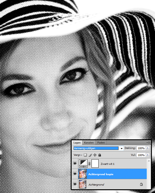Stap 5: Je kan de afbeelding laten zoals hij bij stap 4 was. Als je hem te onherkenbaar vindt kun je hem nog iets aanpassen. Selecteer de ‘achtergrond kopie’ laag en zet deze op ‘vermenigvuldigen’. Zo drukt de stipjeslaag door naar de achtergrond-laag. Je houdt meer detail maar de bolletjes zijn alsnog goed zichtbaar. Klik op deze afbeelding voor een vergroting van het voorbeeld. Succes!