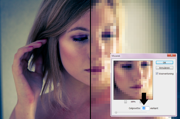 Stap 8: Open nu een foto waar je het patroon op toe gaat passen. Deze foto gaan we (net als de tutorial van vorige week) omzetten in ‘pixels’ met de mozaïek filter. Deze vind je onder ‘filter > pixel > mozaïek…’. Maak de celgrootte net zo groot als je patroon. In ons geval dus 10 pixels!