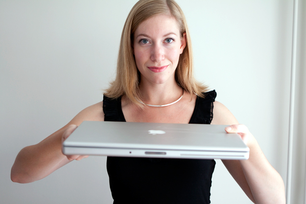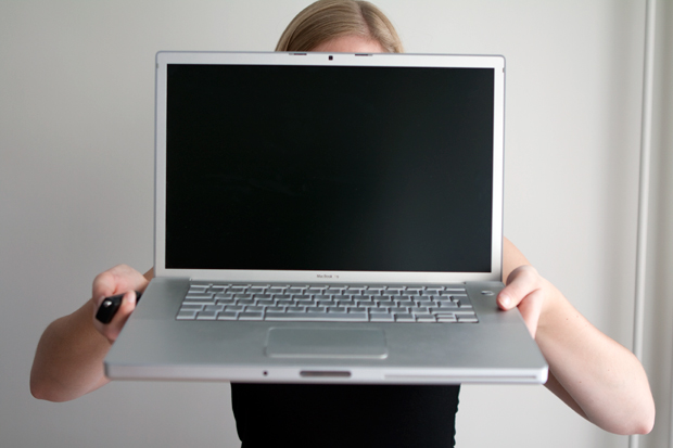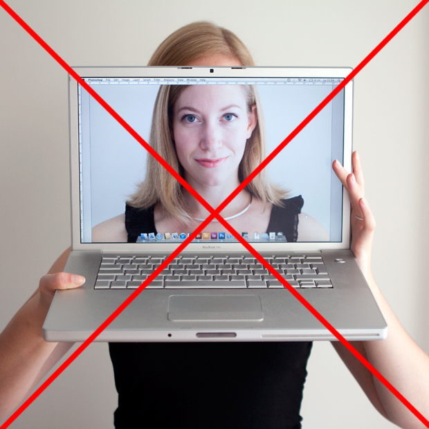 Stap 2: Daarna klap je de laptop dicht en maak je opnieuw een aantal foto’s. Uit deze foto’s kies je straks de foto waaruit je je hoofd gaat gebruiken. Door de laptop vast te blijven houden blijf je lichaam in dezelfde houding. Zo loopt de afbeelding straks mooi door.