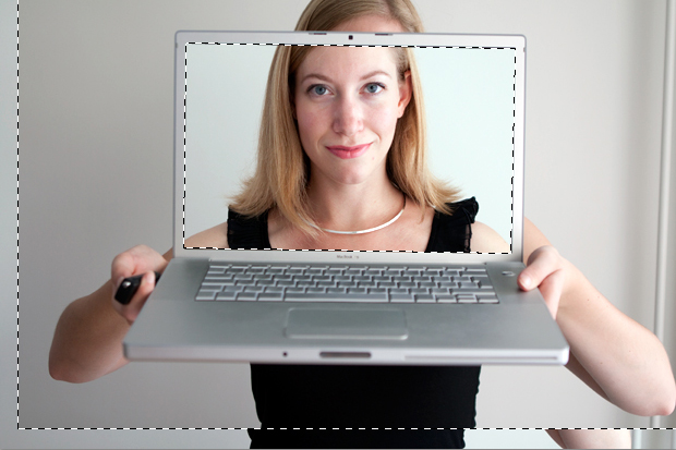 Stap 3: Sluit nu je camera aan op je laptop en laat je statief op dezelfde plek staan. Open de twee foto’s (eentje met laptop voor je hoofd en eentje waarvan je je hoofd wil gebruiken) in Photoshop. Selecteer in de foto met het beeldscherm het zwarte scherm en draai de selectie om (Shift+CTRL+I). Nu heb je dus alles behalve het scherm geselecteerd. Kopieer dit nu en plak het op de foto van je hoofd. Nu kun je hem positioneren zoals je je hoofd in het scherm wil hebben. Laat altijd een stuk van de bovenkant weg zodat je eigen hoofd achter de laptop vandaan kan komen en aansluit op de foto.