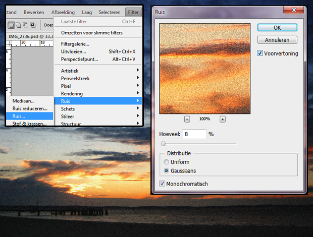 Stap 2: Een kenmerk van oude analoge foto’s is ruis. Die ruis gaan we nu toevoegen! Ga boven in je menubalk naar ‘Filter > Ruis > Ruis…’, er verschijnt een scherm waarin je ruis toe kan voegen. Ik zet hem op 8% en vind het het mooiste als de ruis monochroom (zwart/wit) is. Kies wat je zelf het mooiste vindt en druk op OK.